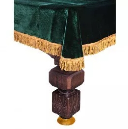 Мы предлагаем вам приобрести чехол для бильярдного стола. Данный чехол предназначен для стола размером в восемь футов, у него влагостойкая пропитка, которая не позволяет воде дойти до бильярдного стола. Чехол выполнен из бархата, это довольно прочный материал, который прослужит долгое время. Особенно подойдёт такое покрывало в том случае, если ваша бильярдная комната выполнена в классических оттенках, так как само покрывало темно-зеленое. По краю покрывала расположена жёлтая бахрома, эта бахрома украшает покрывало, делает его интереснее.